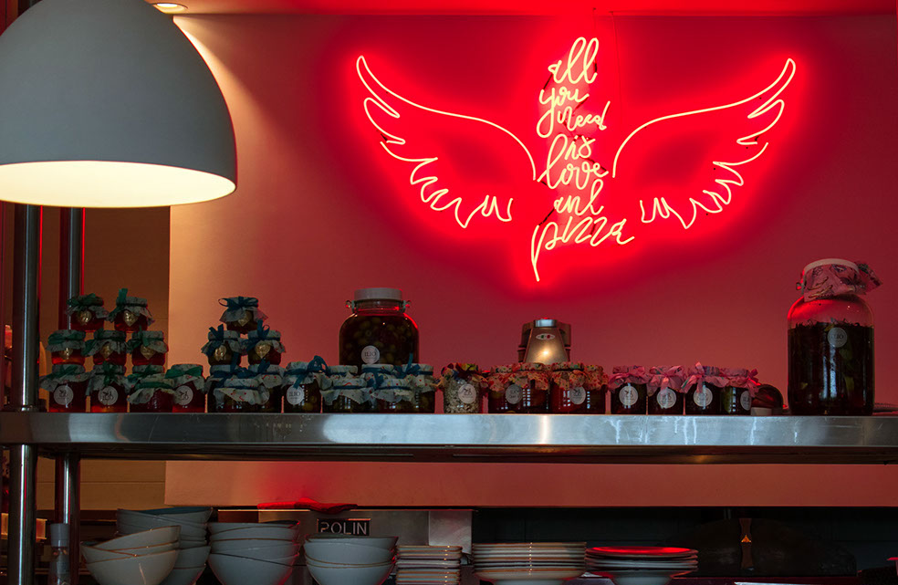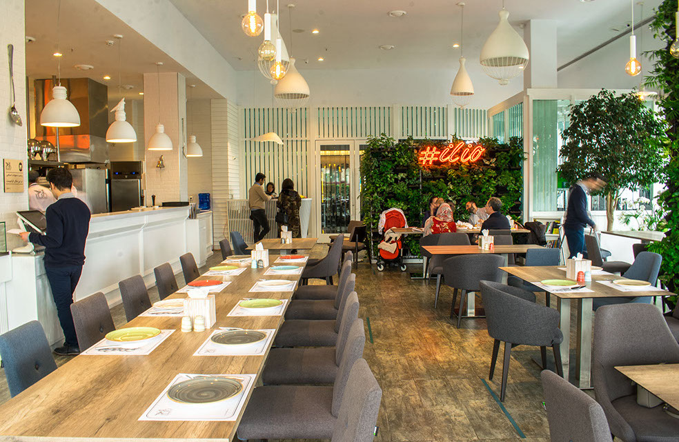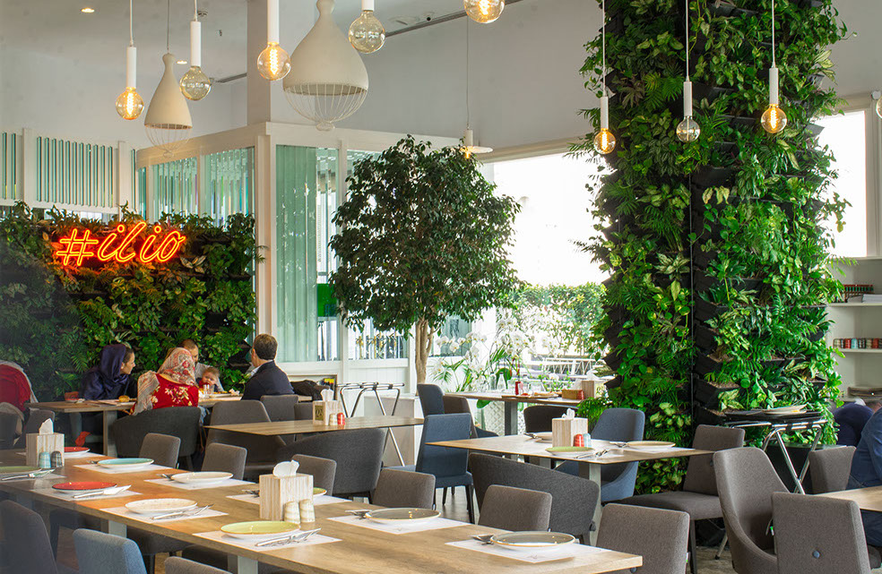 to make privacy of the customers to do not bother while they are eating and also provide a waiting area on the other side which you can easily watch the exhibition of jams and organic sauces produced by ILIO GROUP for sale in the place on the other part of "selfie green wall" photos are showing the restaurant experiences and give social touch that can no longer be dispensed with, especially when the restaurant on their events.