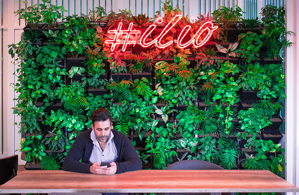 The second zone has been created as an office for the owners near the entrance which is fixed with the "selfie green wall" that has mainly three functions: