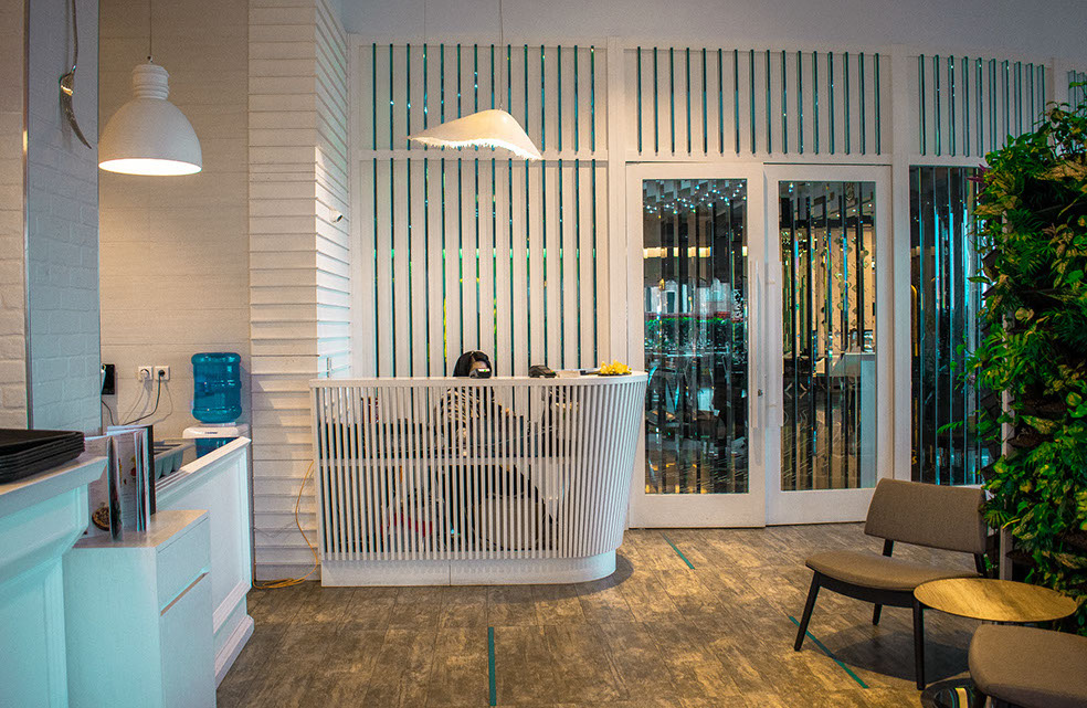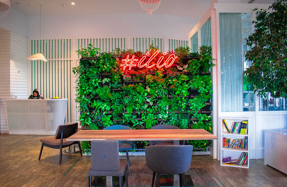 The second zone has been created as an office for the owners near the entrance which is fixed with the "selfie green wall" that has mainly three functions: